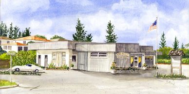 Original Town Hall in former gas station. Town Manager Gail Nelson's car is parked. Helen Shick watercolor c. 1990